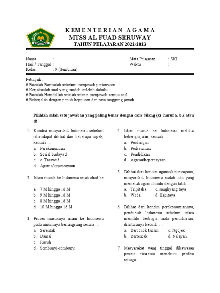 Berikut adalah soal-soal latihan mata pelajaran SKI (Sistem Kewajiban Islam) untuk kelas 9 yang dapat menjadi panduan belajar dalam menghadapi ulangan semester 1 PTS. Soal ini disusun dengan standar pembelajaran yang sederhana, sehingga mudah dipahami oleh peserta didik.