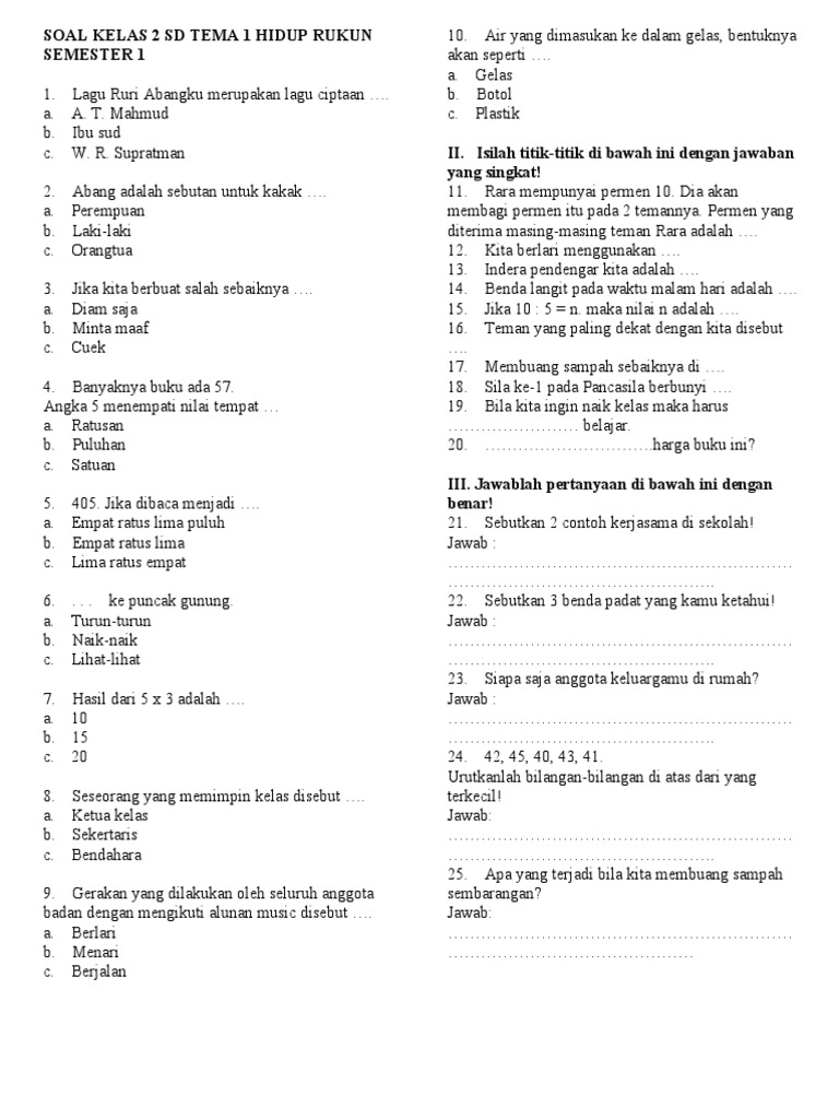 Penilaian Akhir Semester (PAS) atau Sumatif Akhir Semester (SAS) adalah bagian penting dalam proses pembelajaran siswa. Untuk membantu siswa mempersiapkan diri menghadapi ujian ini, disusunlah kumpulan soal latihan yang berisi materi-materi yang telah diajarkan selama semester kedua. Soal-soal ini dirancang agar siswa dapat berlatih dan menguji pemahaman mereka terhadap materi pelajaran.