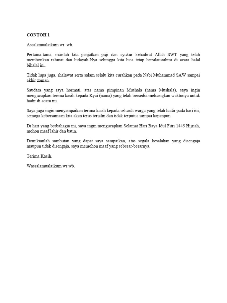 Marilah kita panjatkan puji syukur kehadirat Allah SWT, atas rahmat dan hidayah-Nya yang telah diberikan kepada kita semua, sehingga pada hari yang berbahagia ini kita masih bisa diberi kenikmatan, sehingga kita semua yang hadir disini dapat bertemu bersilaturahmi, khususnya dalam acara halal bihalal, dalam rangka memperingati Hari Raya Idul Fitri yang berbahagia ini.