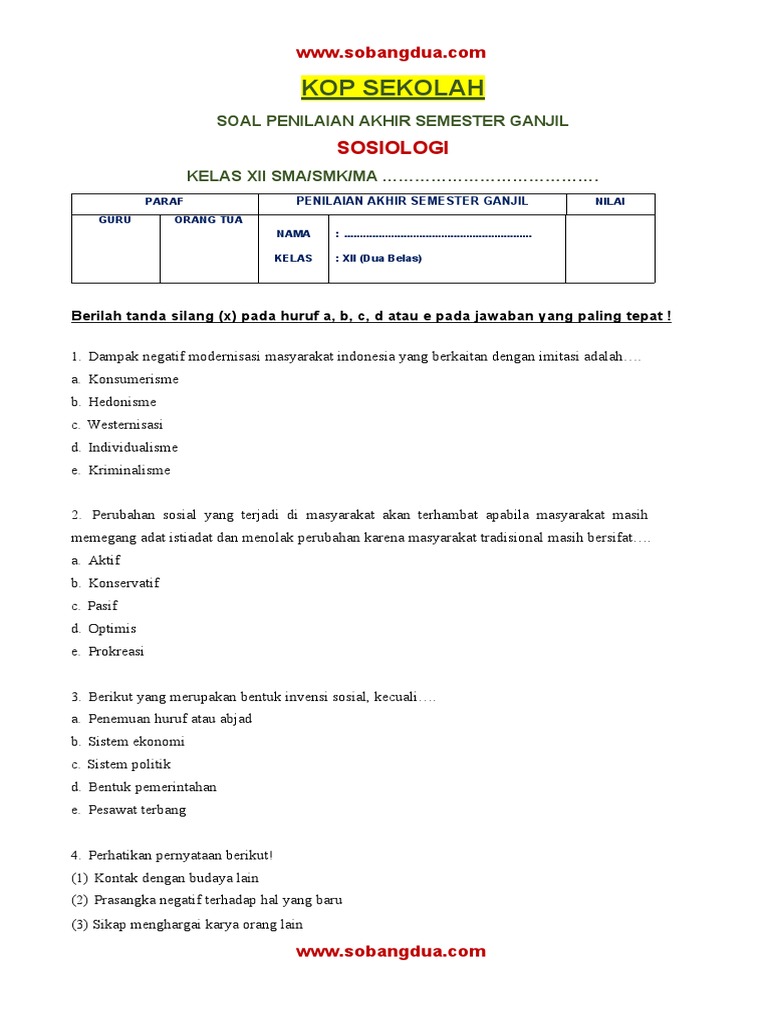 Contoh Soal UAS Sosiologi Kelas 12 Semester 2