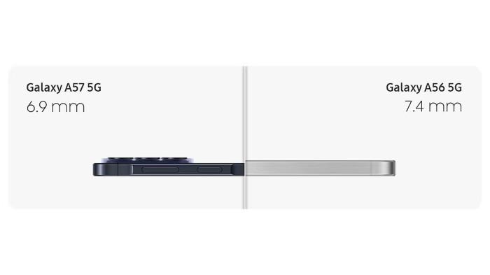 Samsung juga mengumumkan bahwa Galaxy A57 5G memiliki desain yang lebih tipis dibanding generasi sebelumnya, yaitu Galaxy A56 5G. Dengan ketebalan bodi hanya 6,9 mm, Galaxy A57 5G menjadi lebih ramping dan nyaman digenggam dengan satu tangan. Bezel yang lebih tipis di sekeliling layar 6,7 inci FHD+ Super AMOLED Plus milik Galaxy A57 5G juga membuat tampilan lebih luas tanpa gangguan.