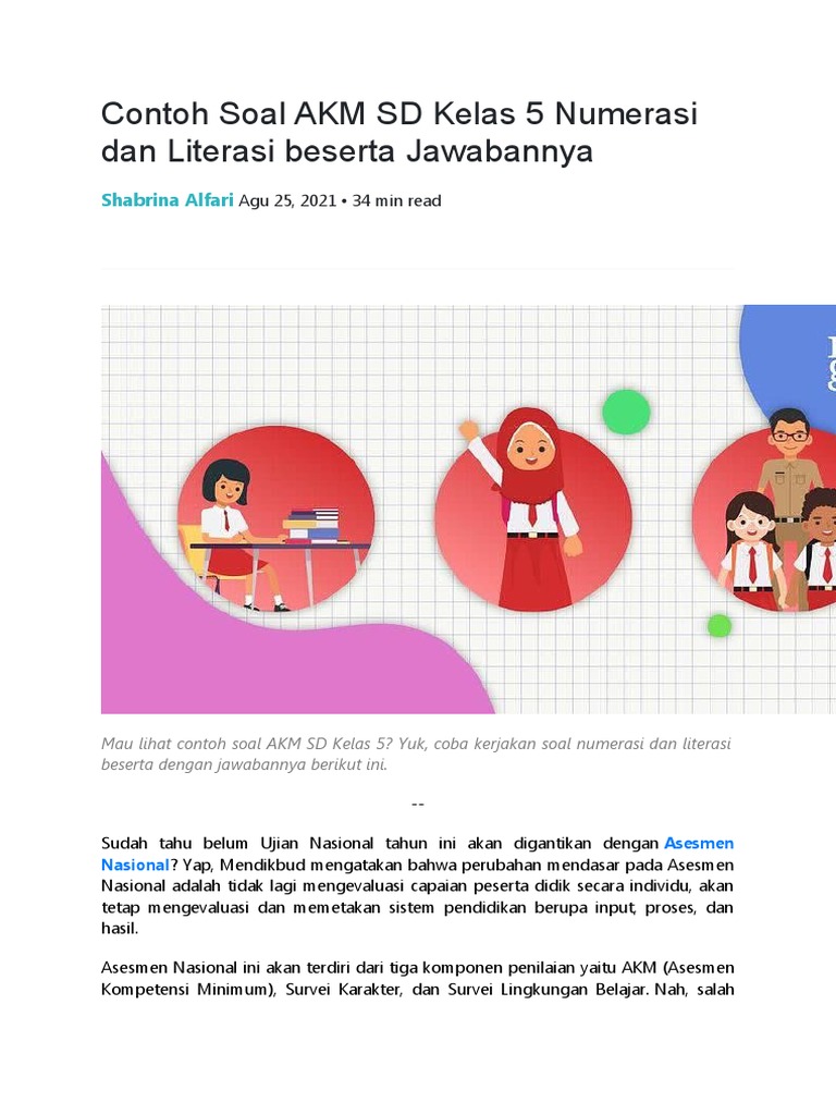 Menjelang pelaksanaan Asesmen Nasional (AN), siswa sekolah dasar perlu memperkuat kemampuan literasi dan numerasi mereka. Hal ini menjadi krusial karena ujian tersebut menguji kompetensi dasar yang sangat penting dalam menunjang pembelajaran di masa depan. Salah satu cara efektif untuk mempersiapkan diri adalah melalui latihan soal Asesmen Kompetensi Minimum (AKM). Dengan berlatih secara konsisten, siswa tidak hanya akan lebih siap menghadapi ujian, tetapi juga mampu memahami penerapan ilmu dalam kehidupan sehari-hari.